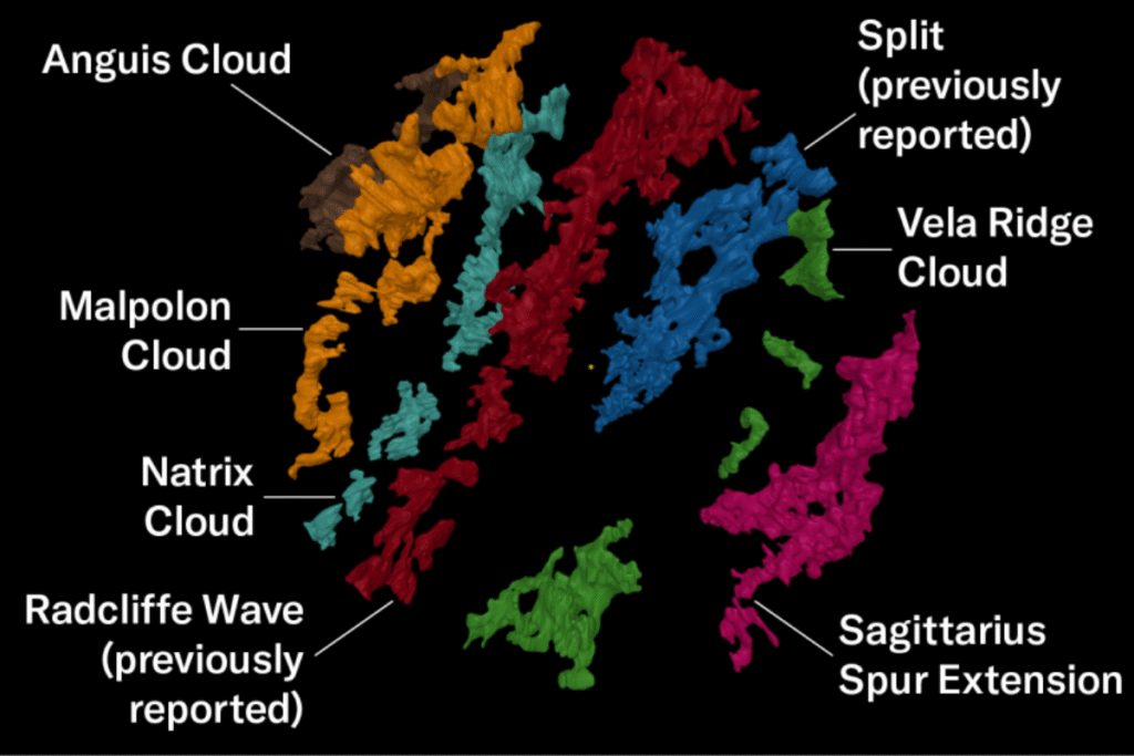 Kormann turned the dust map into one showing the density of hydrogen, which fills up most of the space between stars. Searching for denser regions revealed 40 small clouds whose locations and orientations hinted that some were connected. After linking them up, the team identified seven long superclouds — including the Radcliffe Wave and a previously found one called the Split — lying nearly parallel to each other along the disk of the galaxy. All but the Split zigzag up and down, showing the shape is a common feature.