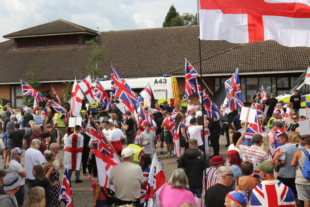 Demonstrators outside the Brook hotel in Norwich, one of a series of protests against asylum seekers being housed in hotels this weekend.